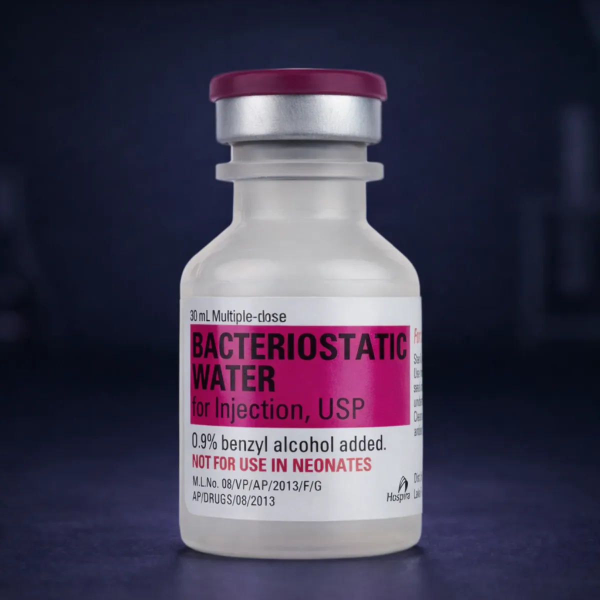 - Hospira Bacteriostatic Water for Injection, USP is a sterile, non-pyrogenic aqueous solution specifically designed as a diluent for reconstituting lyophilized peptides and other research compounds. The formulation contains 0.9% benzyl alcohol (9 mg/mL) as a preservative, allowing for multiple withdrawals from a single 30 mL multi-dose vial when used under proper aseptic technique. Key Specifications